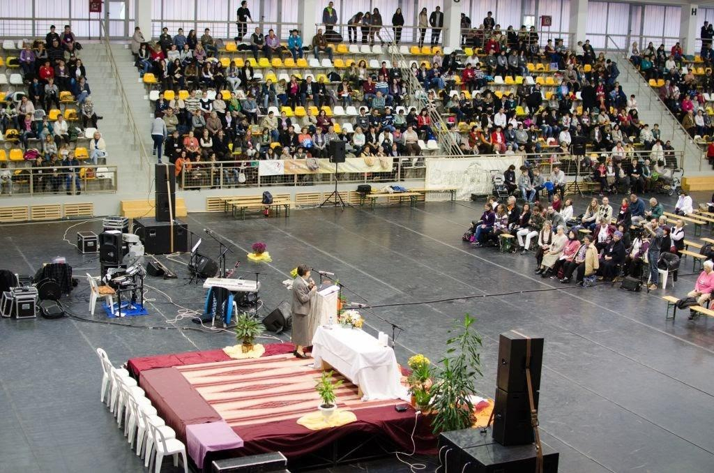 Zsúfolásig telt a sportcsarnok. Hitük megerősítésének reményében találkoznak az erdélyi kisközösségek tagjai